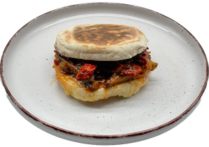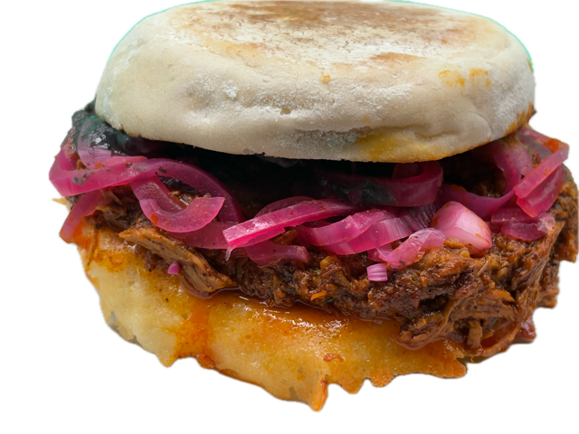Gordinha GringaSandes original com cochinita pibil, feijão preto frito e queijo grelhado, servida em bolo de caco.